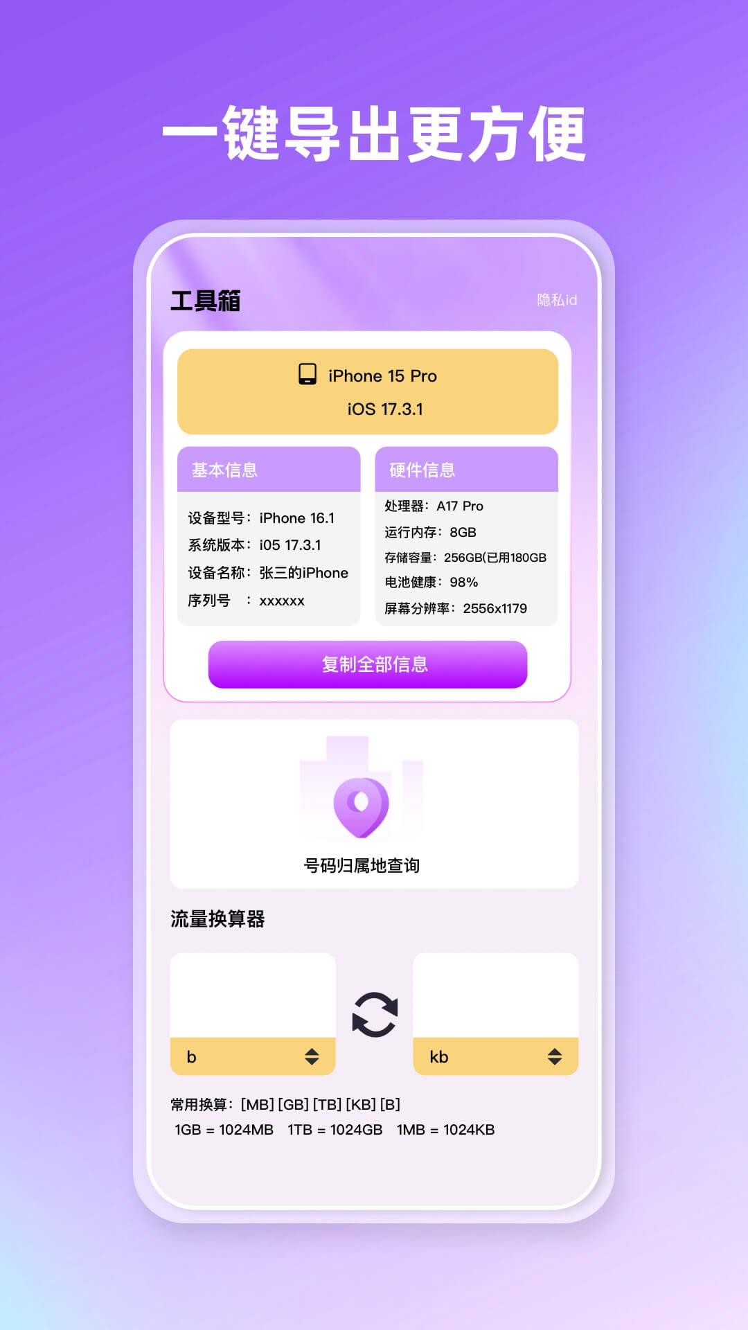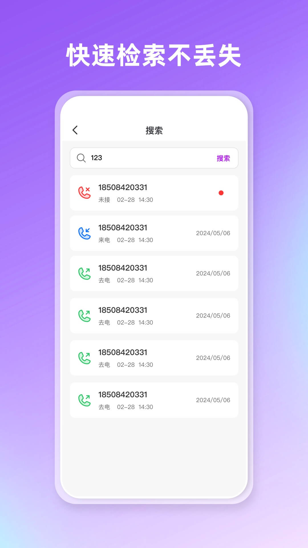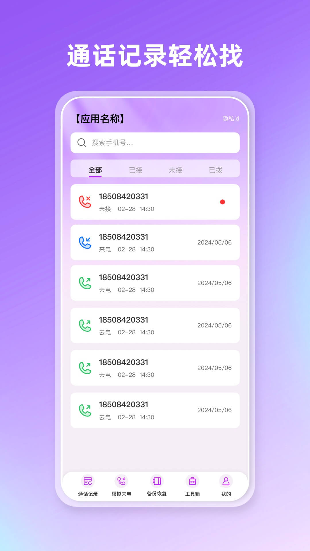 一款集通话记录查询、通讯录备份、模拟来电于一体的实用工具App。支持本机通话记录智能检索,可按已接/未接/已拨分类筛选,手机号模糊搜索快速定位;一键备份通讯录至本地或云端;特色模拟来电功能,可自定义号码、时间、轻松化解尴尬场合。内置设备信息检测、流量单位换算等实用工具,界面简洁操作便捷。无论是商务人士管理客户联系,还是普通用户整理通讯记录,都能高效满足需求,让通讯管理更轻松。