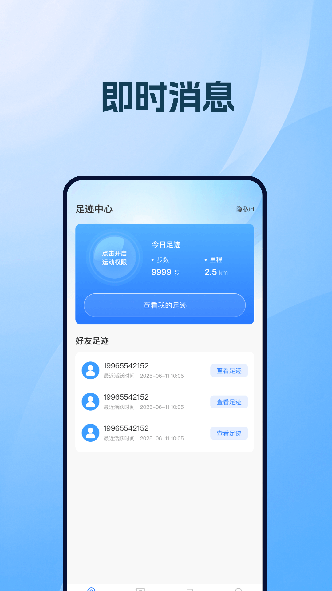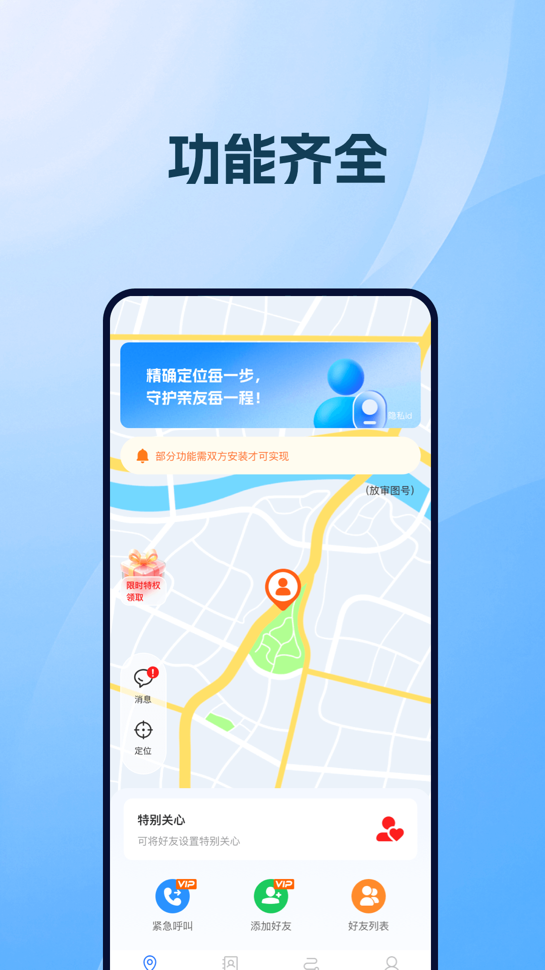 应用核心功能为通过手机号码添加好友可以查看好友的行程轨迹,并且还可以通过视频形式演示其轨迹,还可以查看其途径点;此外还有紧急呼叫功能,可添加紧急联系人在危机时刻点击求助一键发送求助短信至联系人;还有足迹中心可以查看自己的足迹并且对每日的行程步数都进行了一个记录展示。
