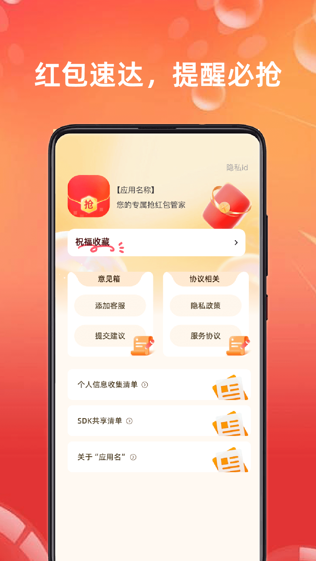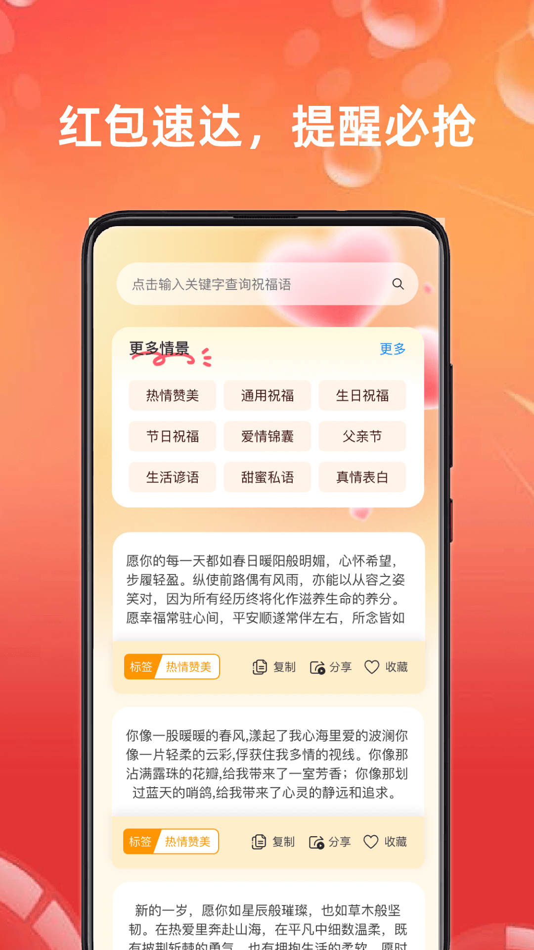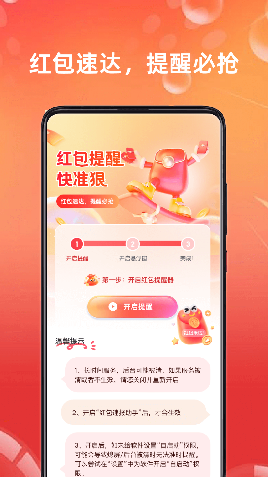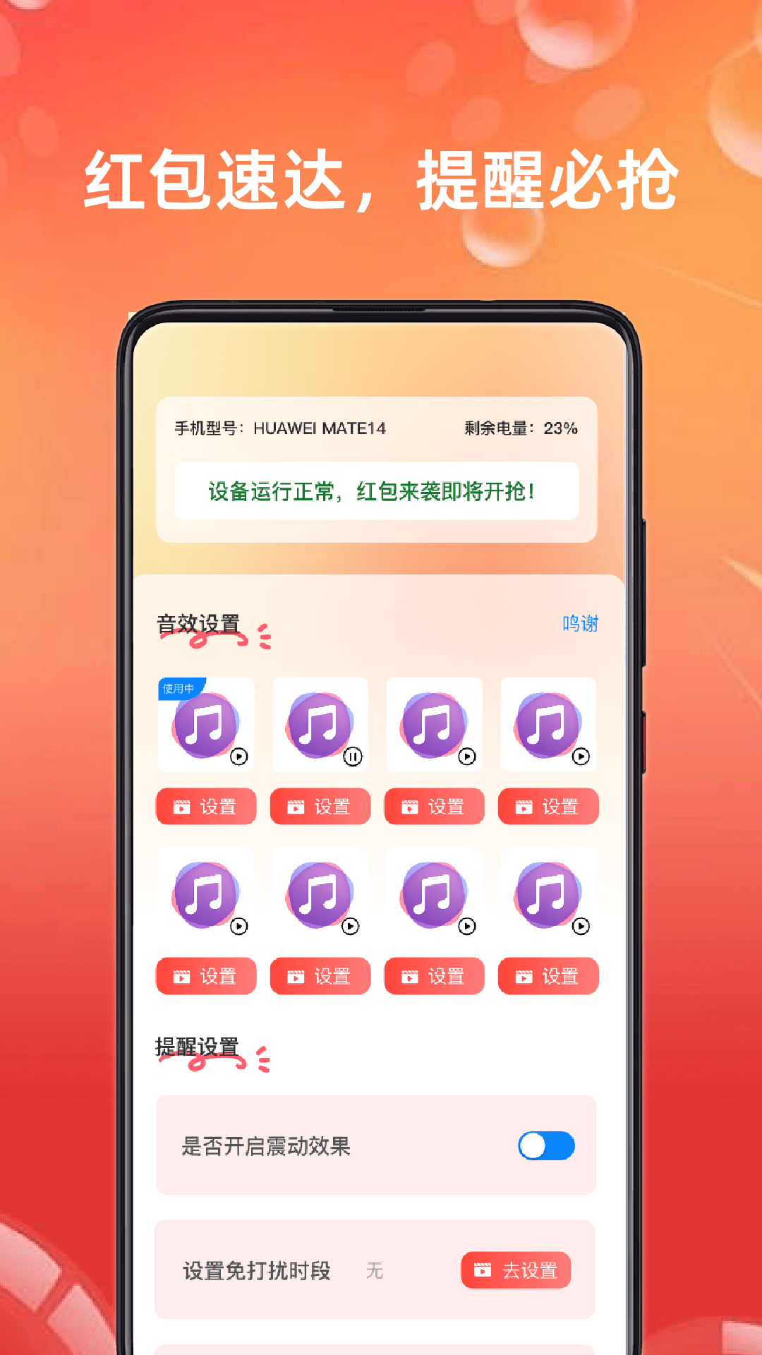 本应用提供红包消息的悬浮窗提醒功能(需按流程开启)。应用内含功能说明与注意事项。附带小费计算工具与随机笑话功能。可自定义提醒音效,选择开启或关闭震动提醒,并设置提醒显示位置(全屏、侧边、顶部)。支持设置免打扰时段,该时段内不进行红包提醒。应用提供多种场景分类的祝福语库,用户可通过关键词搜索相关祝福语,用于发送红包时搭配使用。