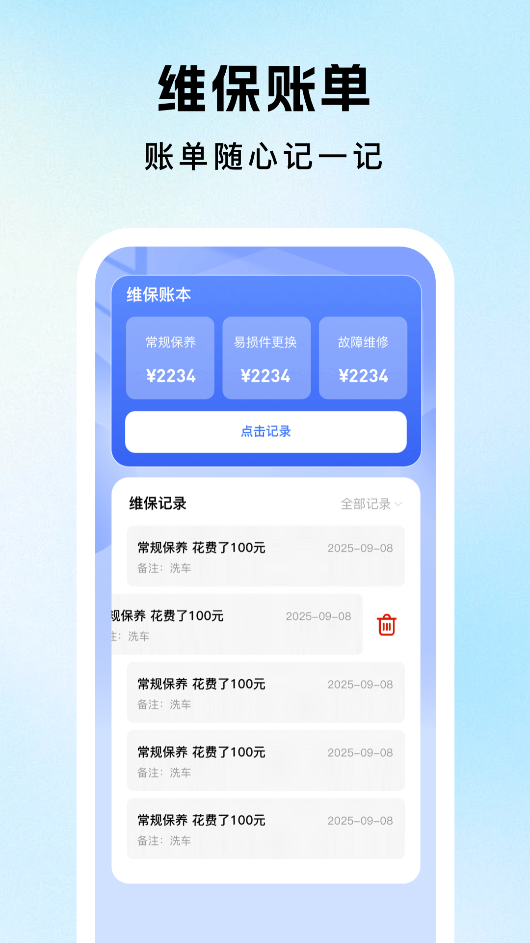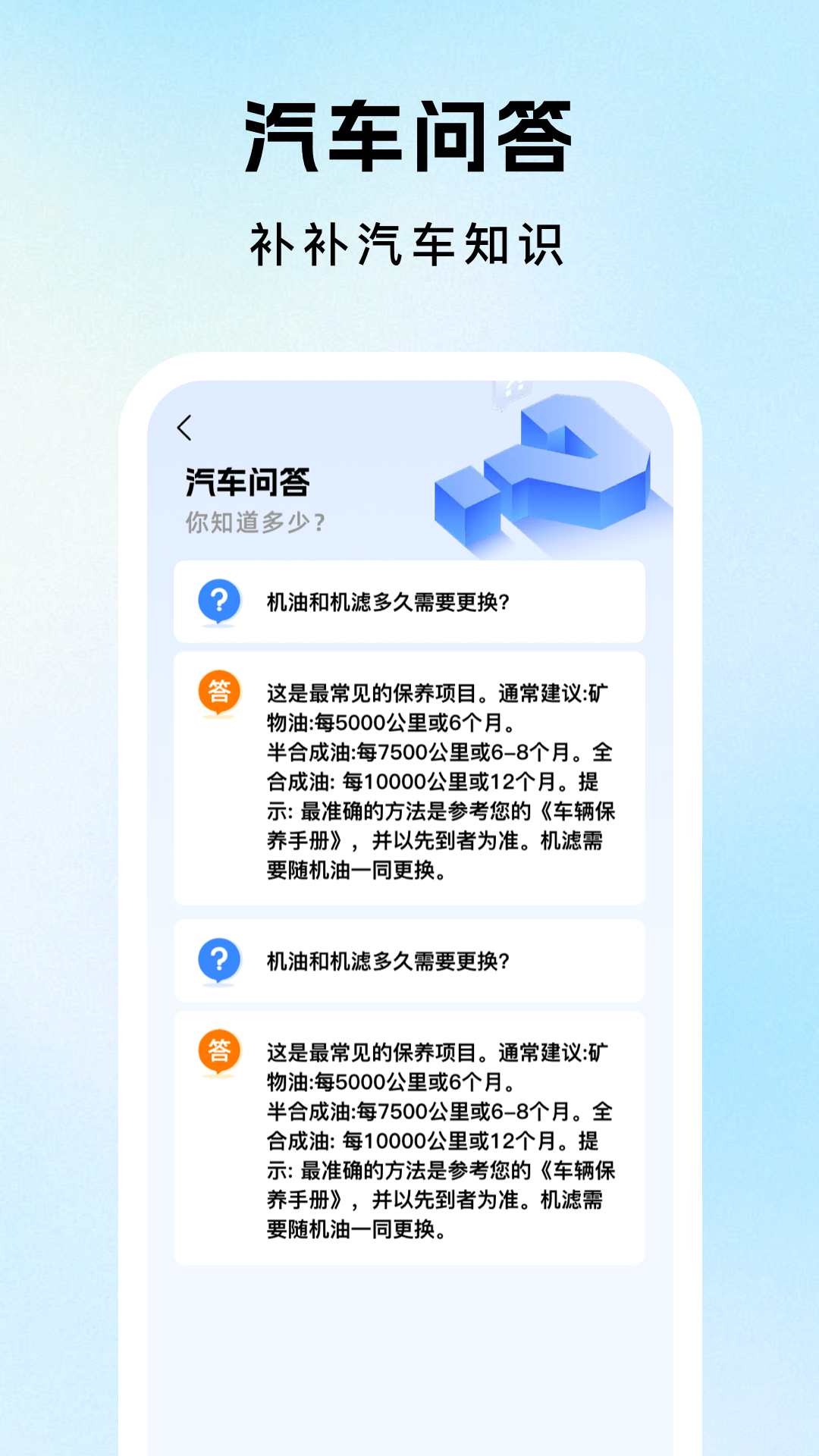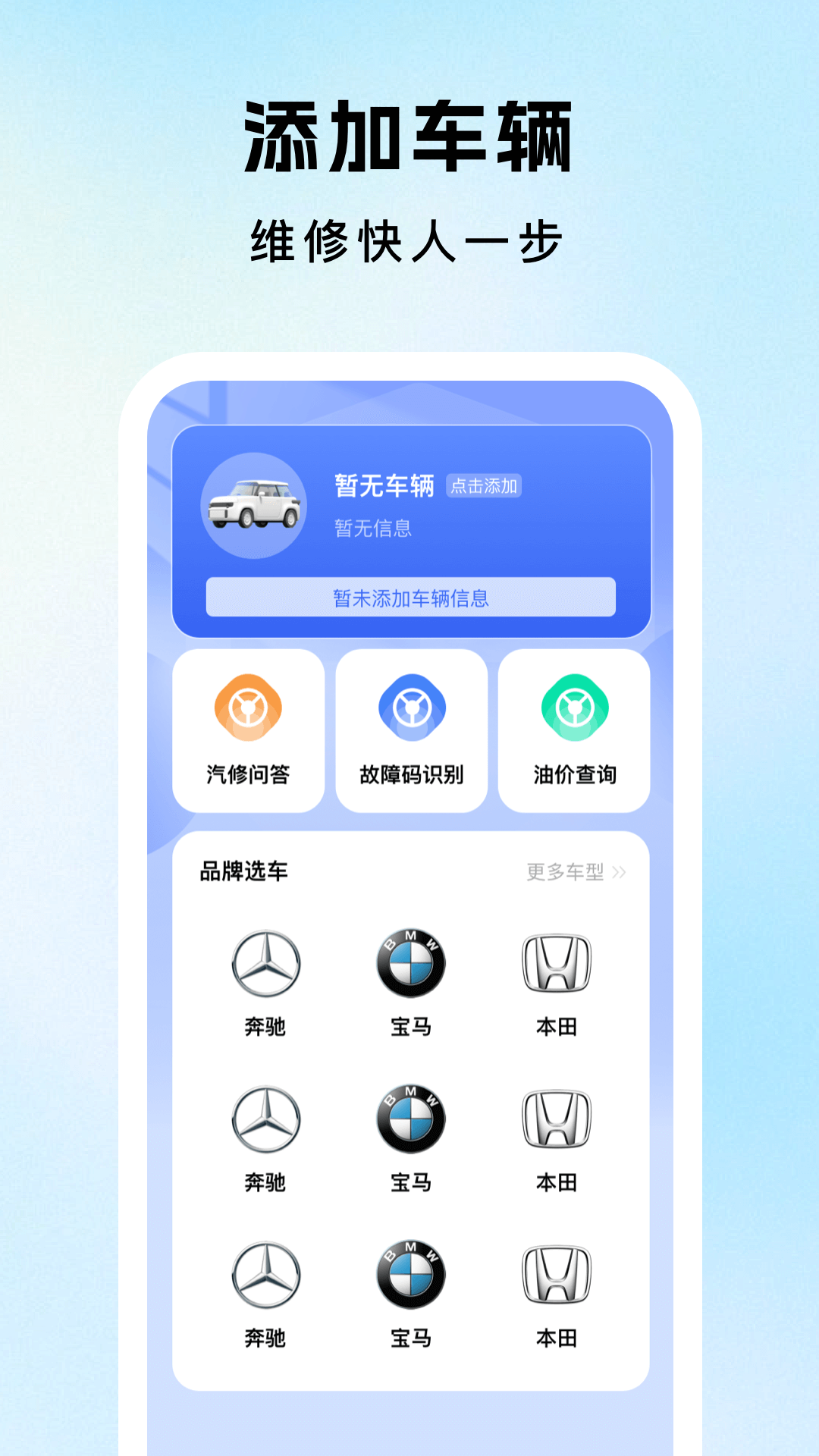 本应用提供车辆信息添加与管理功能,可记录车辆基本信息。内置汽修常识快问快答,并提供故障码查询工具以辅助诊断。
